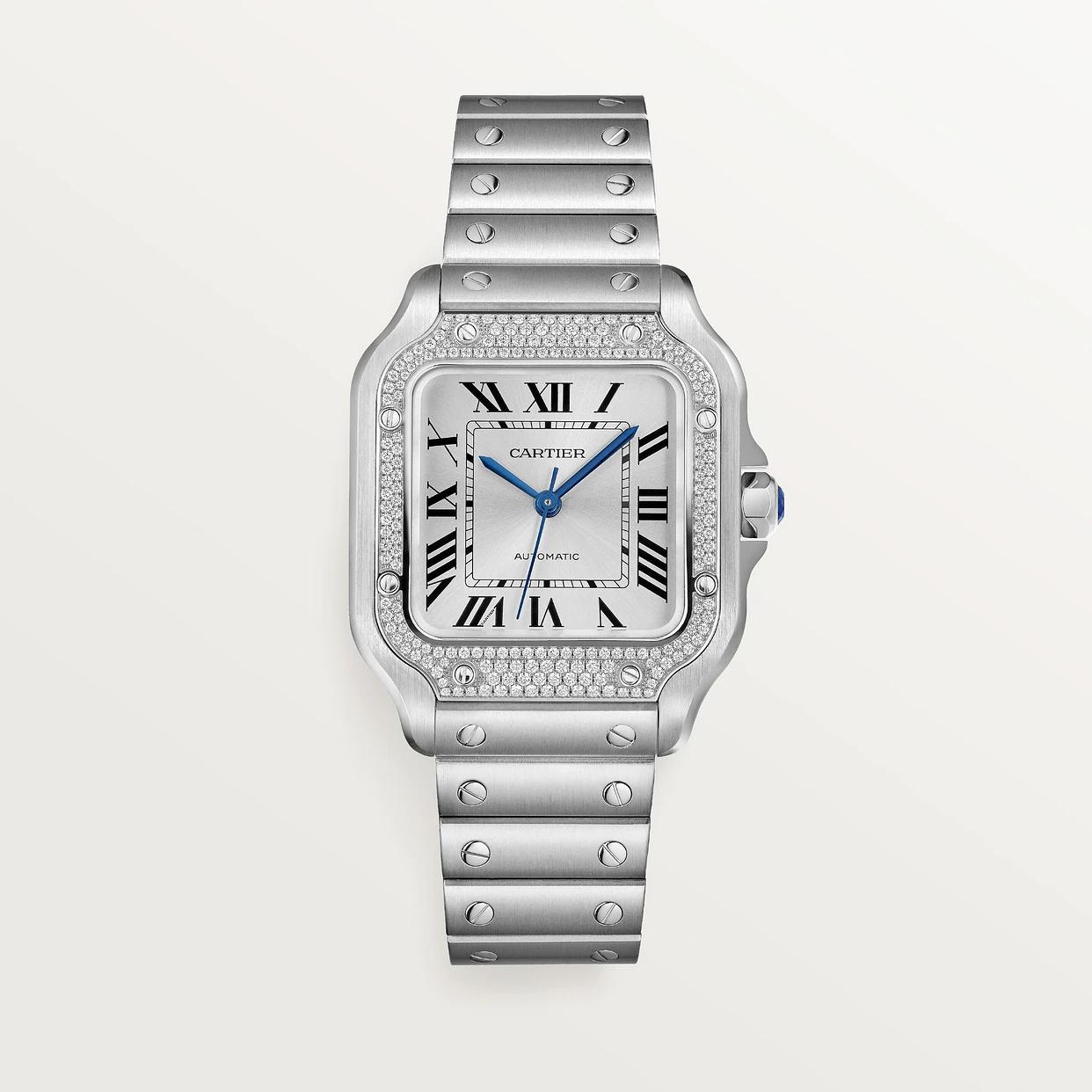 Reloj Cartier Santos, tamaño mediano acero y bisel con diamantes. Referencia W4SA0005.