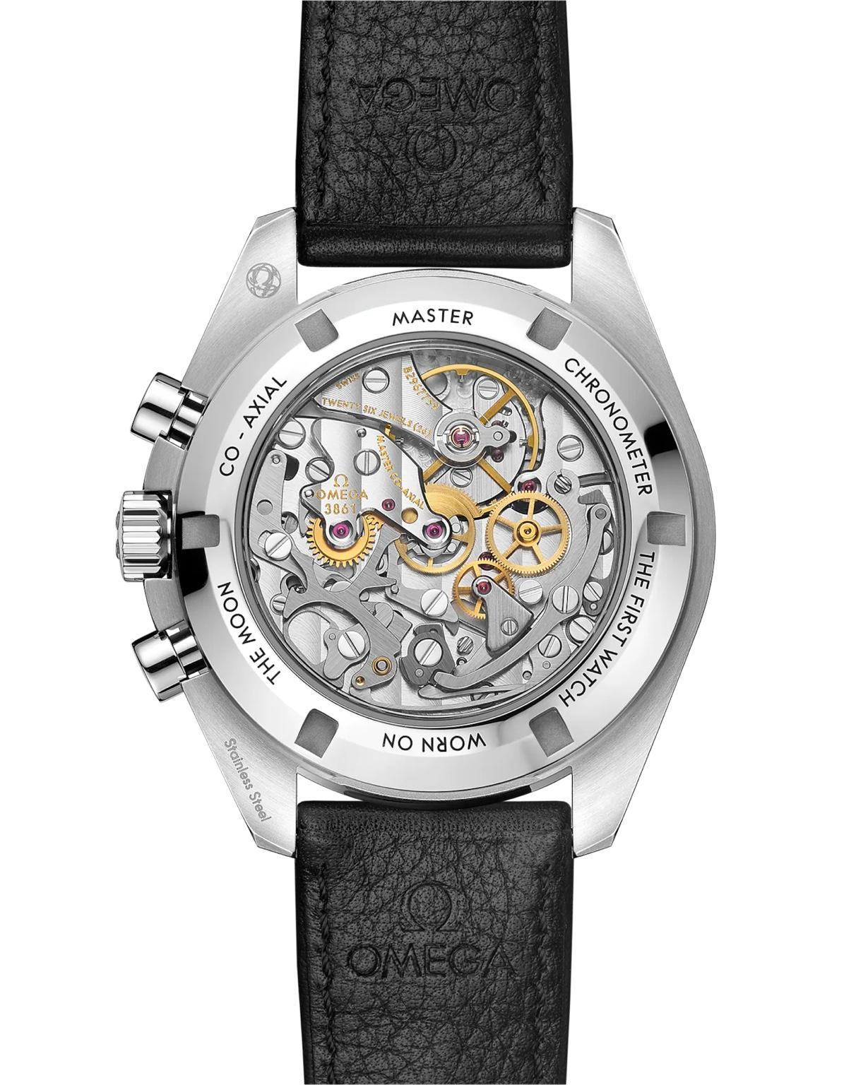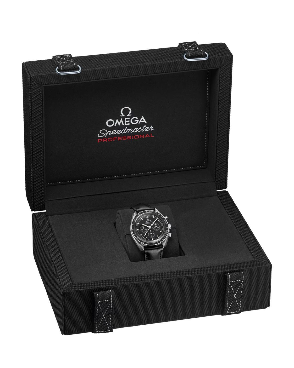 Presentado con una pulsera de piel negra, este Moonwatch de 42 mm en acero noble luce en el frente un cristal de zafiro y también en el fondo de caja. Inspirado en la cuarta generación del estilo Speedmaster utilizado en la Luna, también incluye una caja asimétrica, esfera negra achaflanada con logotipo OMEGA en aplique y el famoso círculo sobre el 90 del aro de bisel en aluminio anodizado.