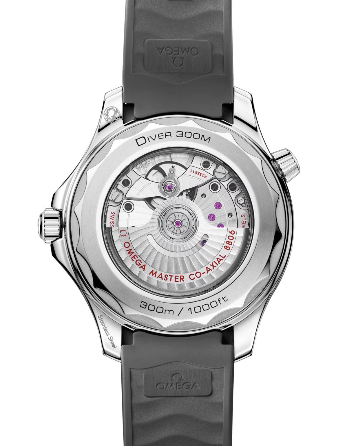 El reloj se presenta con una pulsera de caucho gris integrada con cierre desplegable y está equipado con el movimiento OMEGA Co-Axial Master Chronometer calibre 8806, visible a través del cristal de zafiro del fondo de caja.