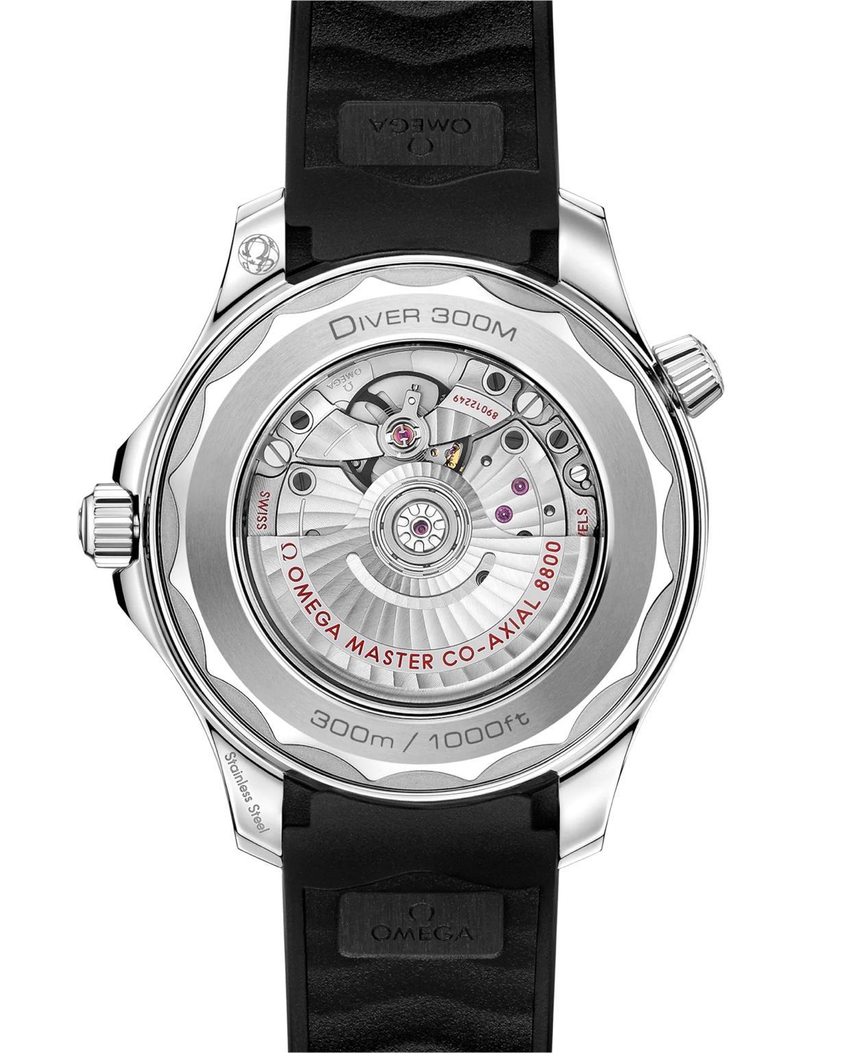 El reloj, presentado con pulsera de caucho negro, incorpora el calibre OMEGA Master Chronometer 8800, visible a través del cristal de zafiro del fondo de caja con borde ondulado.
