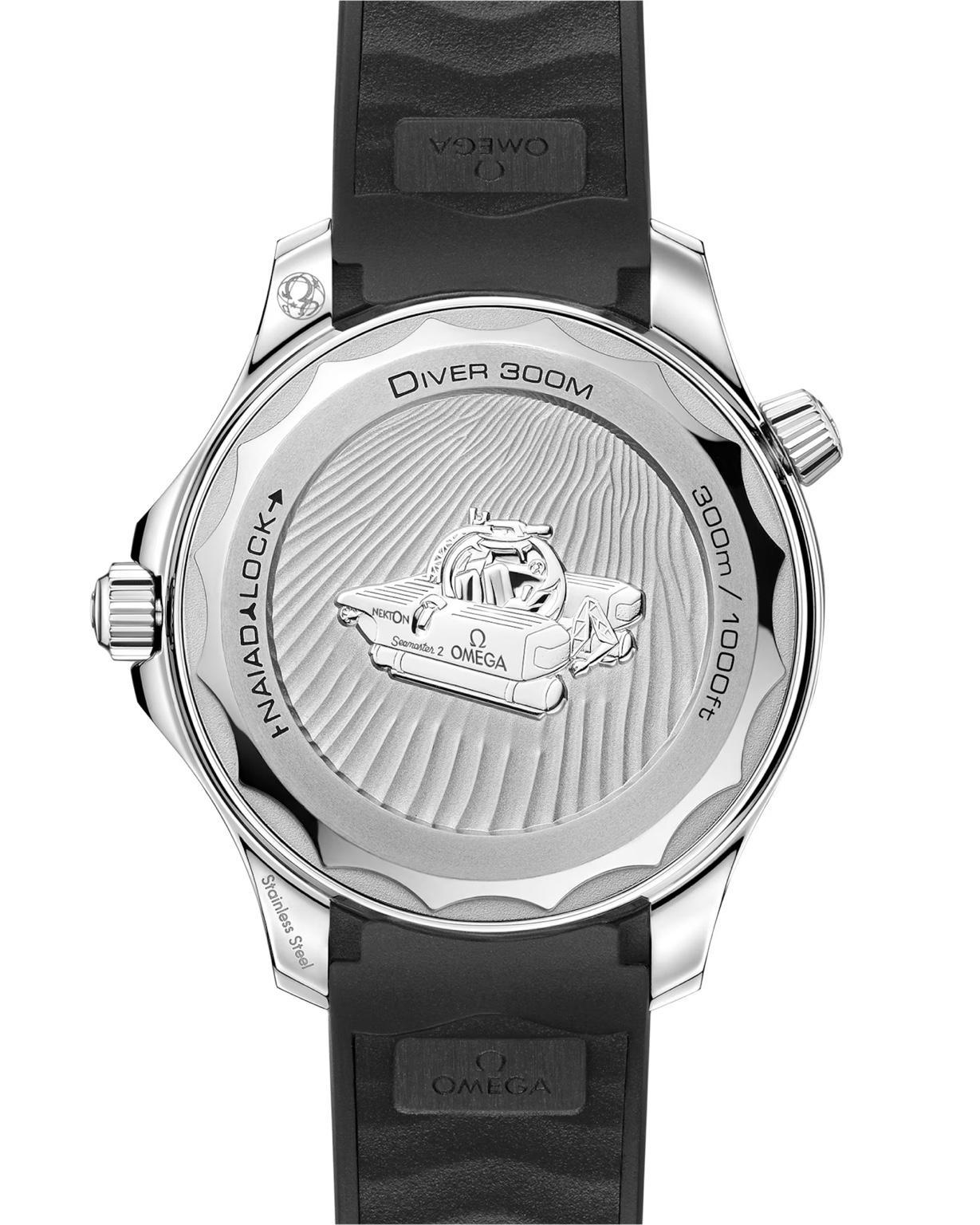 El fondo de caja, grabado con el medallón del submarino Nekton, está orientado por el innovador NAIAD LOCK de OMEGA. Una pulsera de caucho negro integrada, con hebilla pulida y cepillada, complementa magníficamente la esfera en cerámica negra.