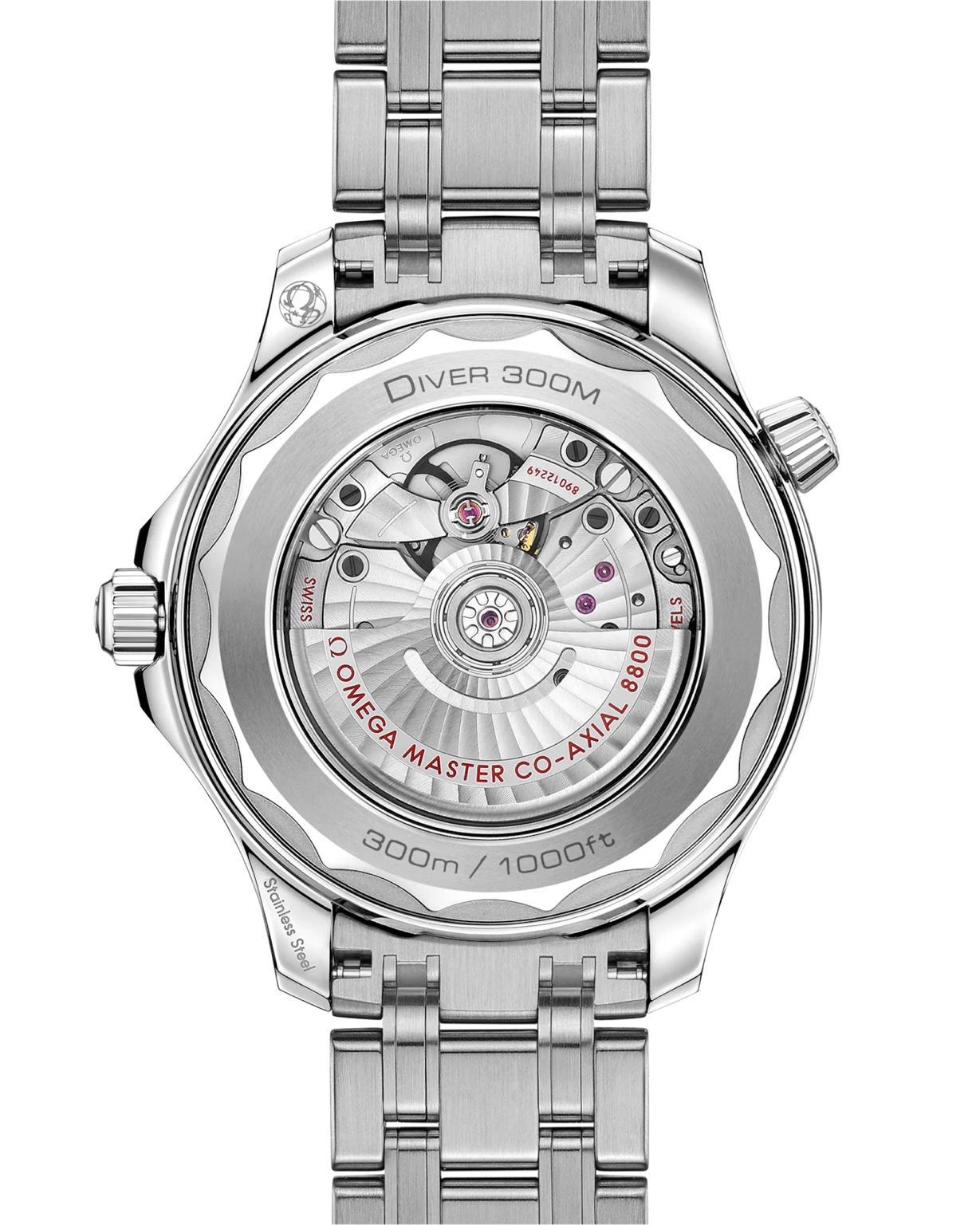 Este reloj se presenta con un brazalete ajustable de acero noble con extensión de inmersión adicional y está equipado con el Calibre OMEGA Master Chronometer 8800, un movimiento excepcional que puede observarse a través del fondo de caja de cristal de zafiro con motivo de ondas.