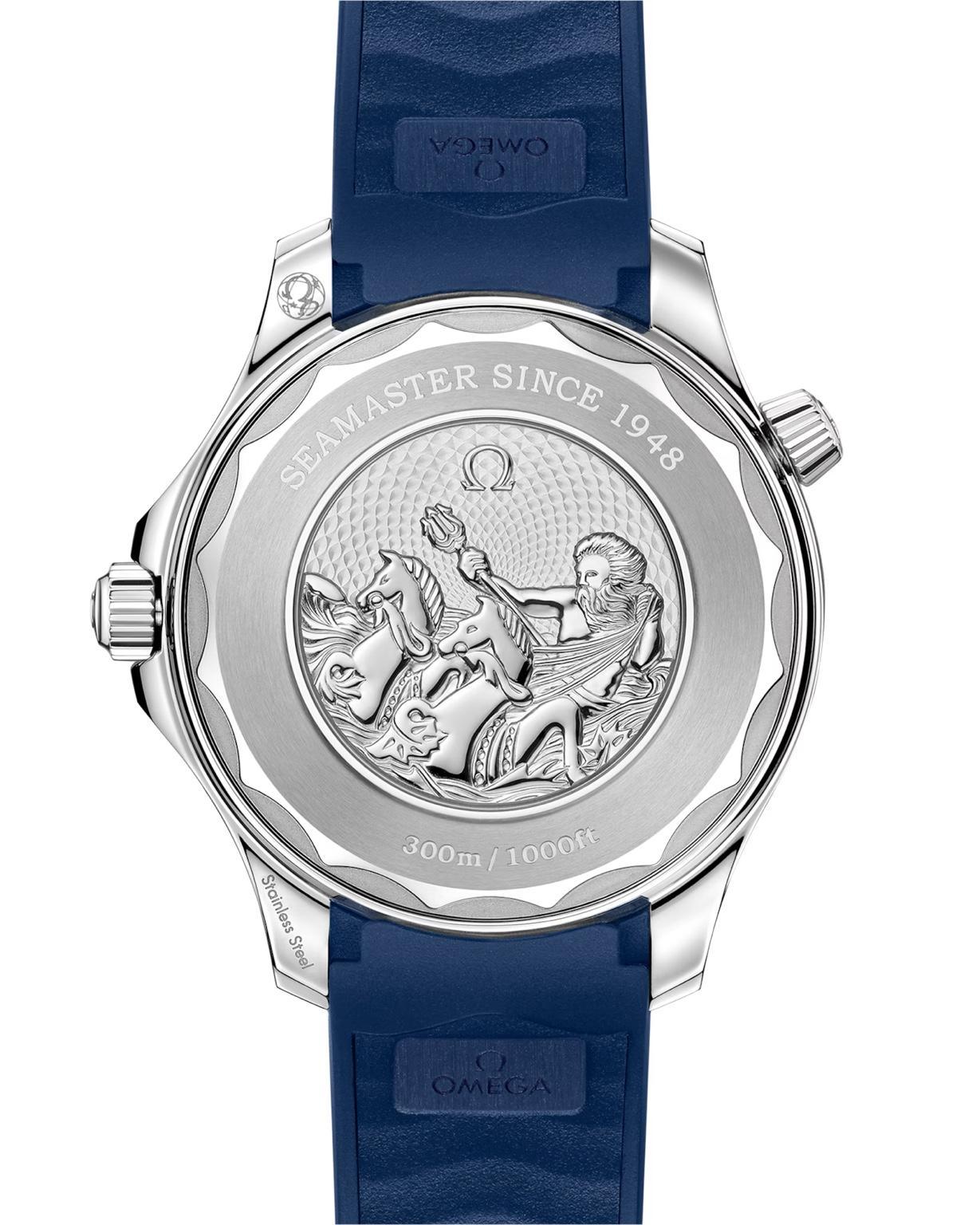 El reloj, presentado con pulsera de caucho azul, incorpora el calibre OMEGA Master Chronometer 8800, visible a través del cristal de zafiro del fondo de caja con borde ondulado.