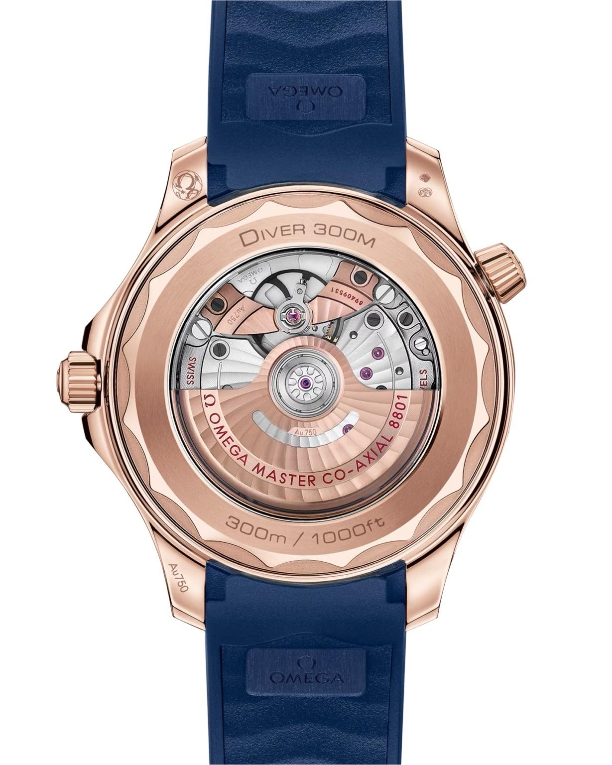 El reloj se presenta con pulsera de caucho azul e incorpora el movimiento OMEGA Master Chronometer calibre 8801, visible a través del cristal de zafiro del fondo de caja con borde ondulado.