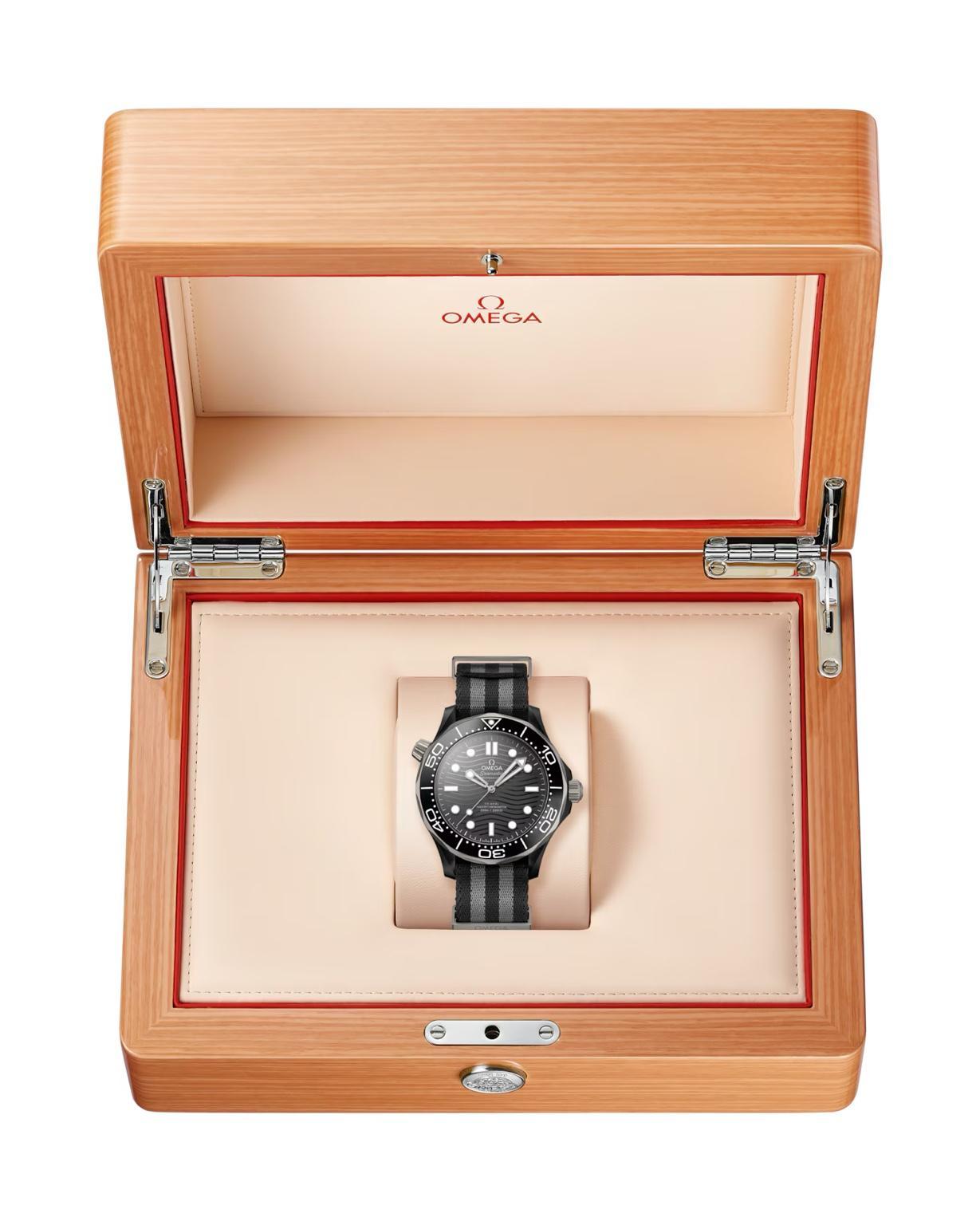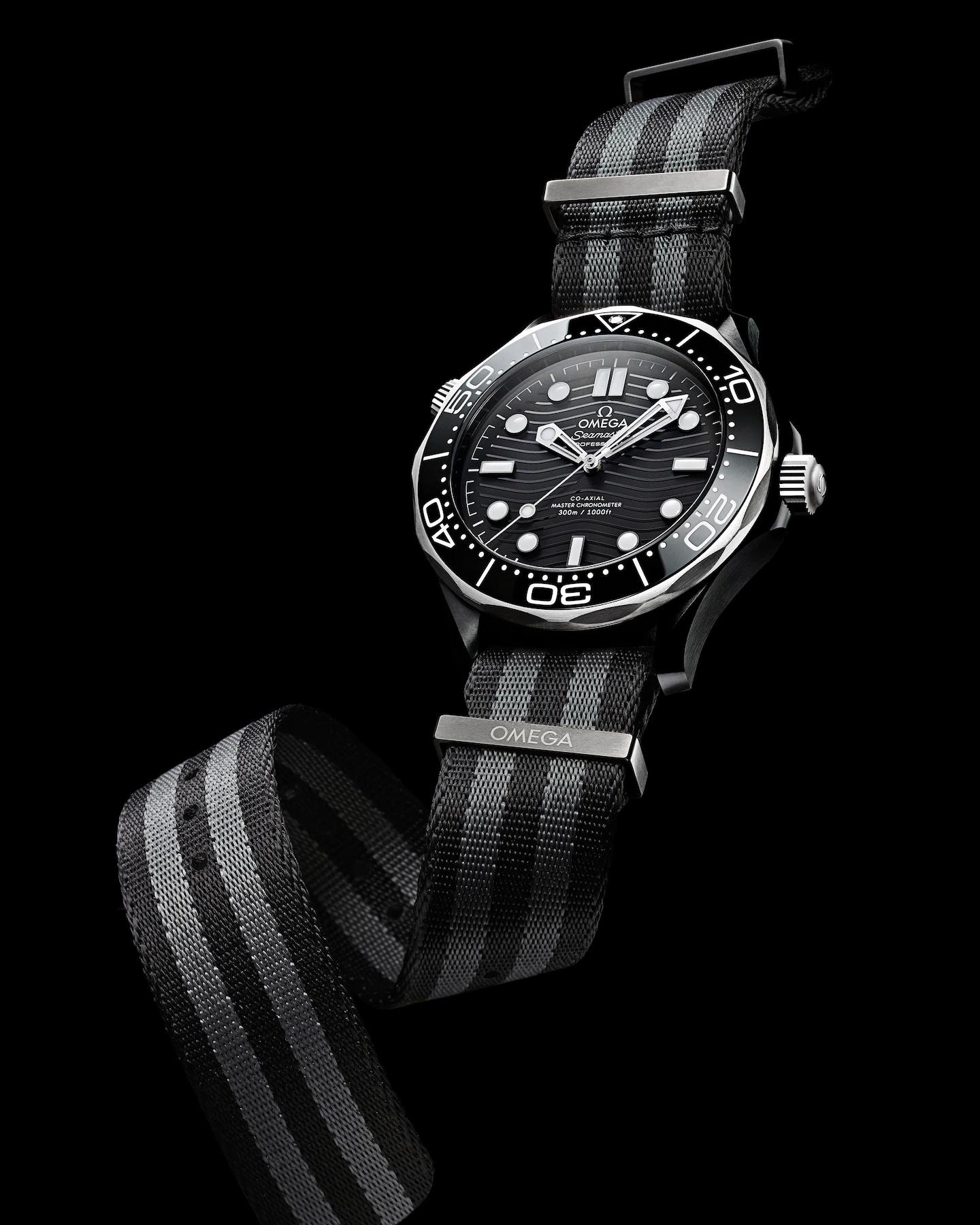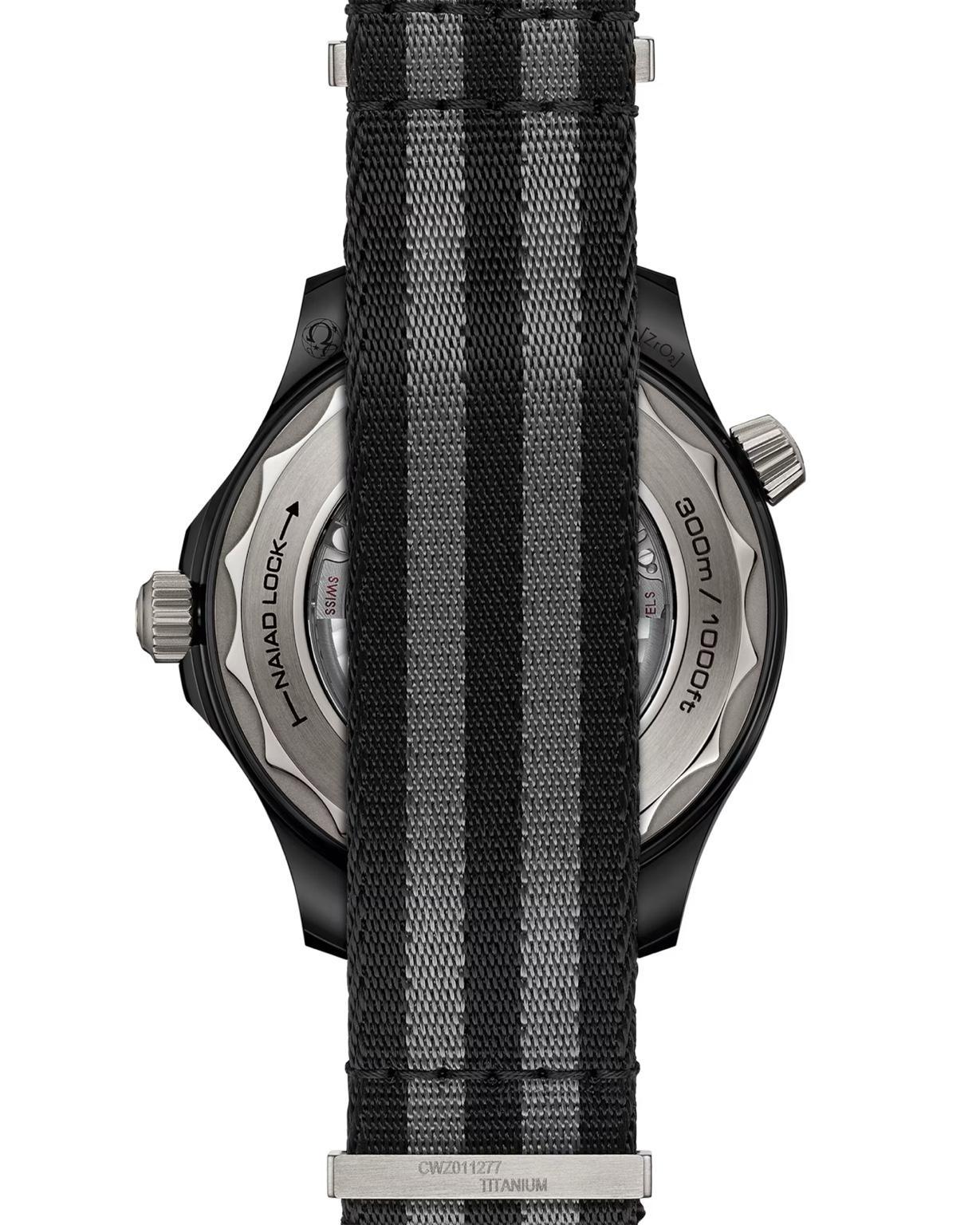 El reloj se presenta con una pulsera NATO de 5 listas en negro y gris, con hebilla cepillada y una trabilla de titanio, e incorpora el calibre OMEGA Master Chronometer 8806, que puede verse a través del cristal de zafiro del fondo de caja con borde ondulado.