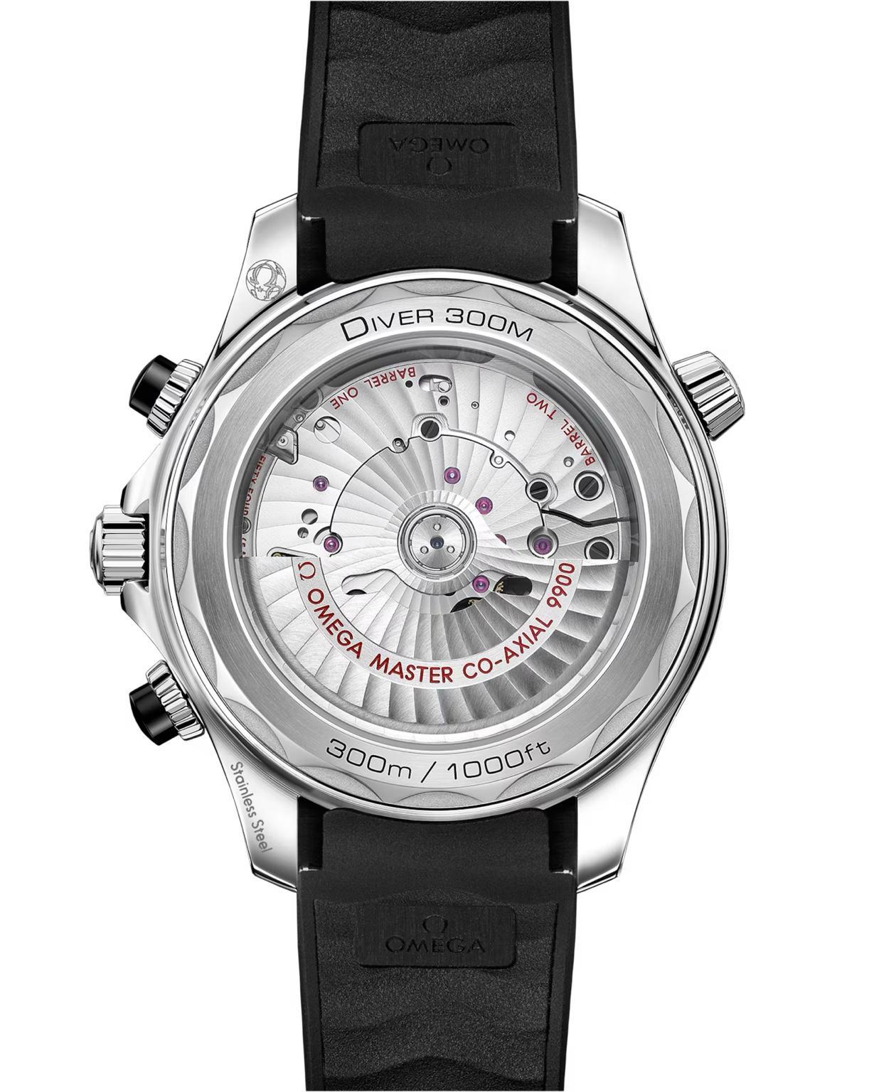 El reloj se presenta con una pulsera de caucho negro e incorpora el movimiento OMEGA Master Chronometer calibre 9900, visible a través del cristal de zafiro del fondo de caja con borde ondulado.