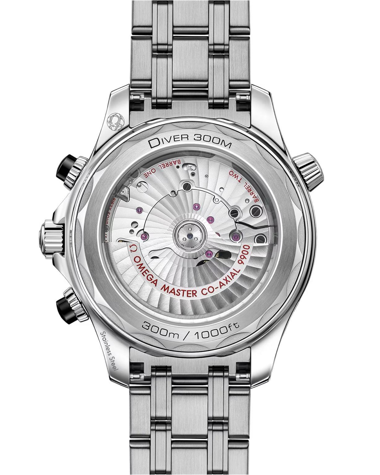El reloj se presenta con un brazalete en acero noble e incorpora el movimiento OMEGA Master Chronometer calibre 9900, visible a través del cristal de zafiro del fondo de caja con borde ondulado.
