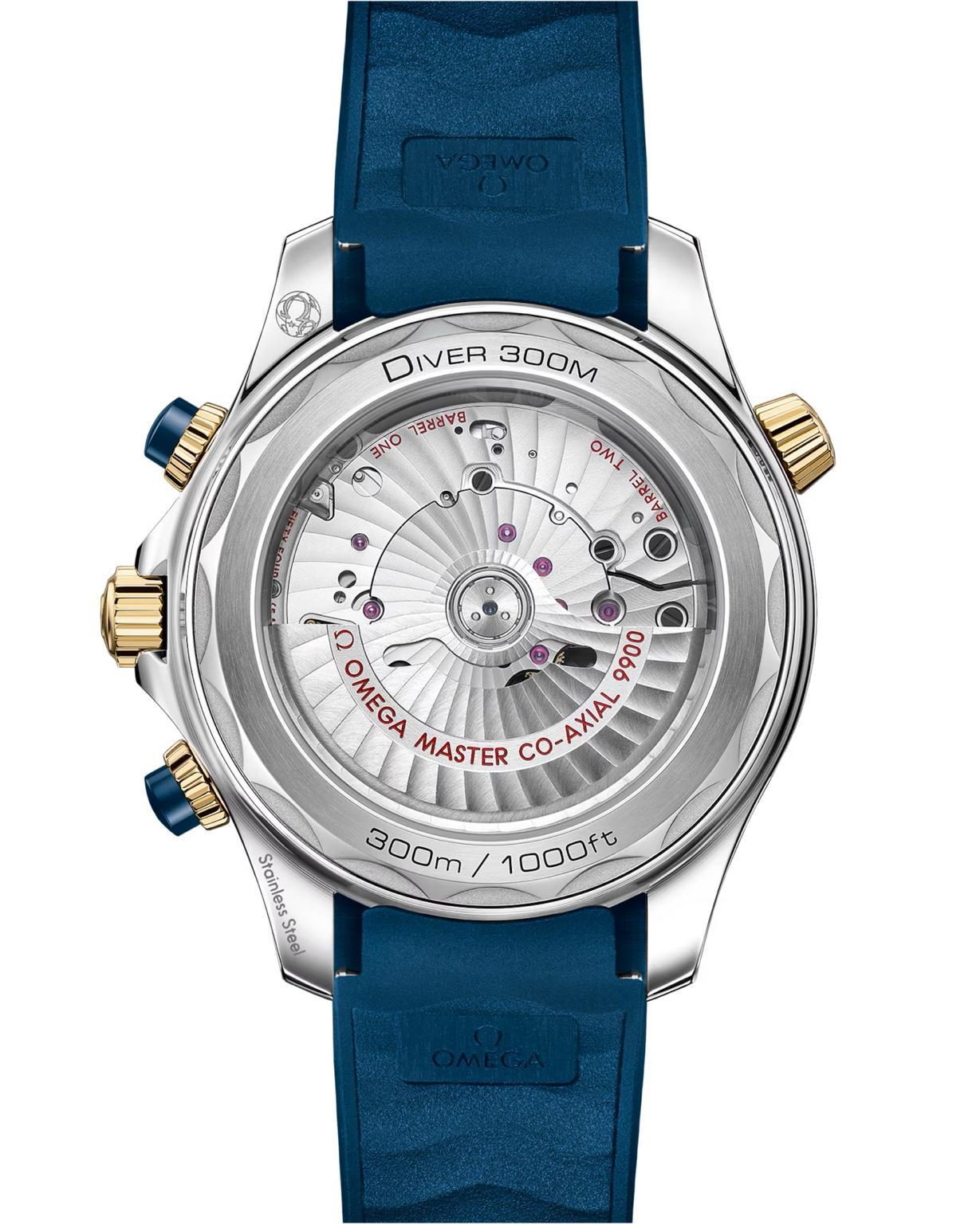 El reloj se presenta con una pulsera de caucho azul e incorpora el movimiento OMEGA Master Chronometer calibre 9900, visible a través del cristal de zafiro del fondo de caja con borde ondulado.