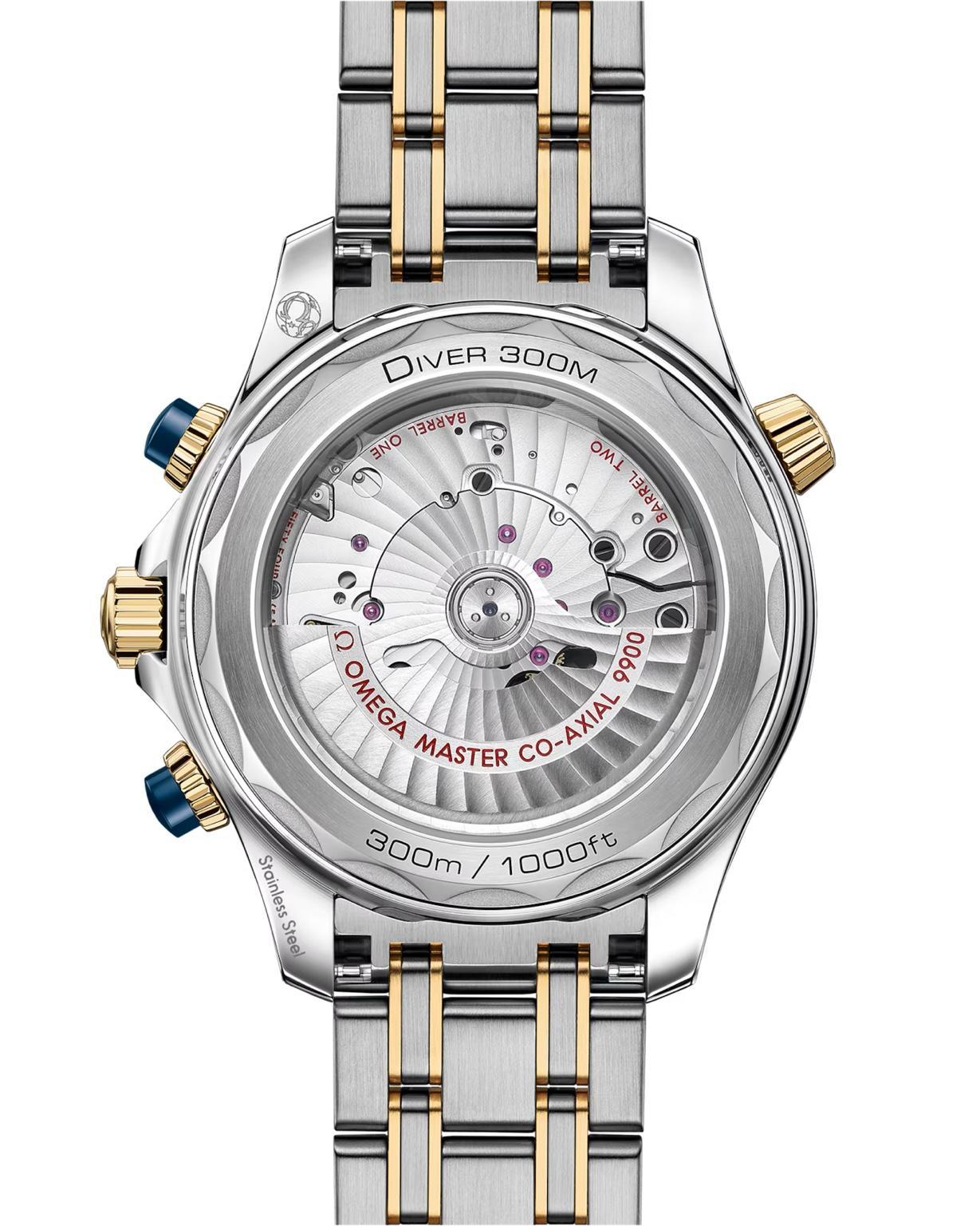 El reloj se presenta con un brazalete en acero noble y oro amarillo de 18 qt e incorpora el movimiento OMEGA Master Chronometer calibre 9900, visible a través del cristal de zafiro del fondo de caja con borde ondulado.