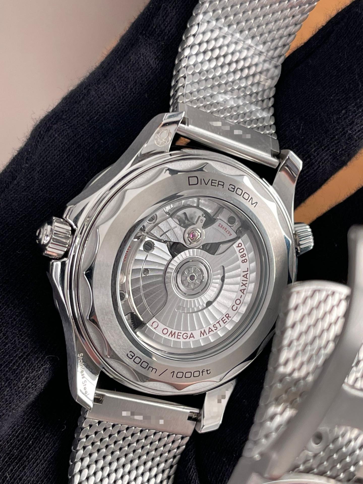 El reloj se presenta con un brazalete de malla cepillado con cierre y está equipado con el movimiento OMEGA Co-Axial Master Chronometer calibre 8806, visible a través del cristal de zafiro del fondo de caja.