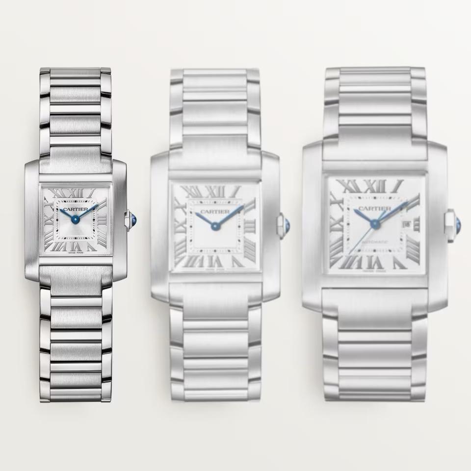 Reloj Tank Française, tamaño pequeño, movimiento de cuarzo. Caja de acero. Corona poligonal de acero decorada con un cabujón de espinela sintética. Esfera plateada efecto rayos de sol, agujas de acero azulado en forma de espada, cristal de zafiro. Brazalete de acero. Dimensiones de la caja: 25,7 mm x 21,2 mm. Grosor: 6,8 mm. Hermético hasta 3 bares (~30 metros).