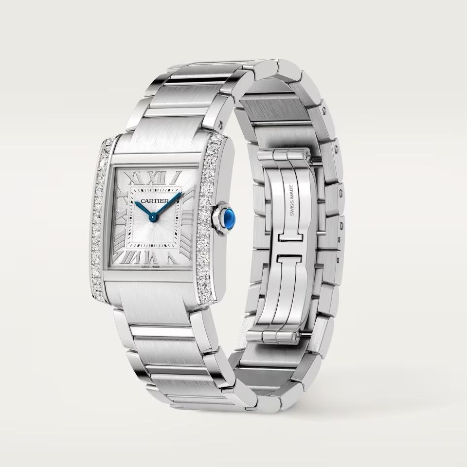 Reloj Tank Française, tamaño mediano, movimiento de cuarzo. Caja de acero engastada con 26 diamantes talla brillante con un total de 1,09 quilates, corona poligonal de acero decorada con un cabujón de espinela sintética azul. Esfera plateada efecto rayos de sol, agujas de acero azulado en forma de espada, cristal de zafiro. Brazalete de acero. Dimensiones de la caja: 32 mm x 27 mm, grosor: 7,1 mm. Hermético hasta 3 bares (~30 metros).